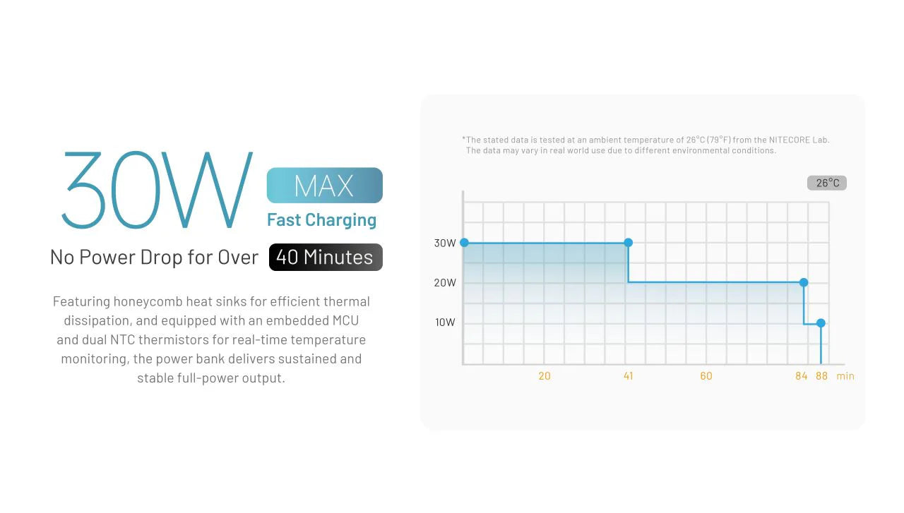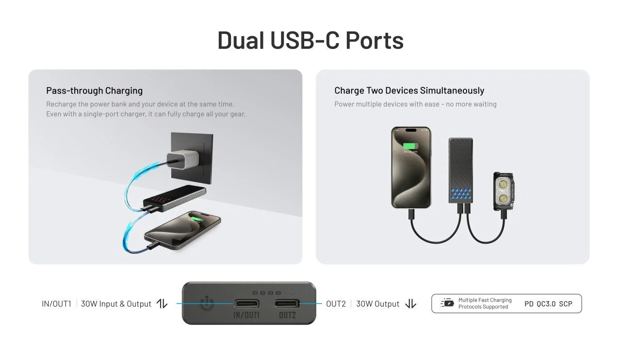 The Carbo 10000 Gen2’s dual USB-C ports provide fast, convenient charging for a wide range of devices. Supporting up to 30W fast charging, it powers your gear quickly and efficiently - and maintains full speed for over 40 minutes without slowing down, so your devices spend less time plugged in. You can also charge multiple devices simultaneously or recharge the power bank while it’s powering another device. Checking the remaining battery is simple—just press the power button to illuminate the four blue LED indicators.